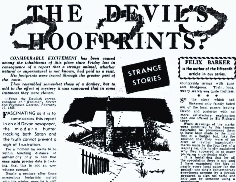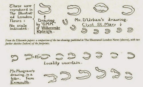 “Na quinta-feira à noite, ao que parece, houve uma forte nevasca nas proximidades de Exeter e no sul de Devon. Na manhã seguinte os habitantes dessas cidades ficaram surpresos ao descobrirem as pegadas de um animal estranho, misterioso e onipresente, pois as pegadas foram vistas nos lugares mais inacessíveis – nos telhados, em corredores estreitos, em jardins e quintais fechados com cercas e muros altos, bem como nos campos ao ar livre. Pareciam mais pegadas de um bípede do que de um quadrúpede, e distanciavam-se 20 cm umas das outras. As impressões das patas lembravam muito uma ferradura de burro e tinham de 3,5 a 6,5 cm de largura em certos casos. Às vezes pareciam estar rachadas, mas na maioria dos passos a ferradura persistia e, como a neve no centro estava intacta, mostrando apenas o contorno da pata”.