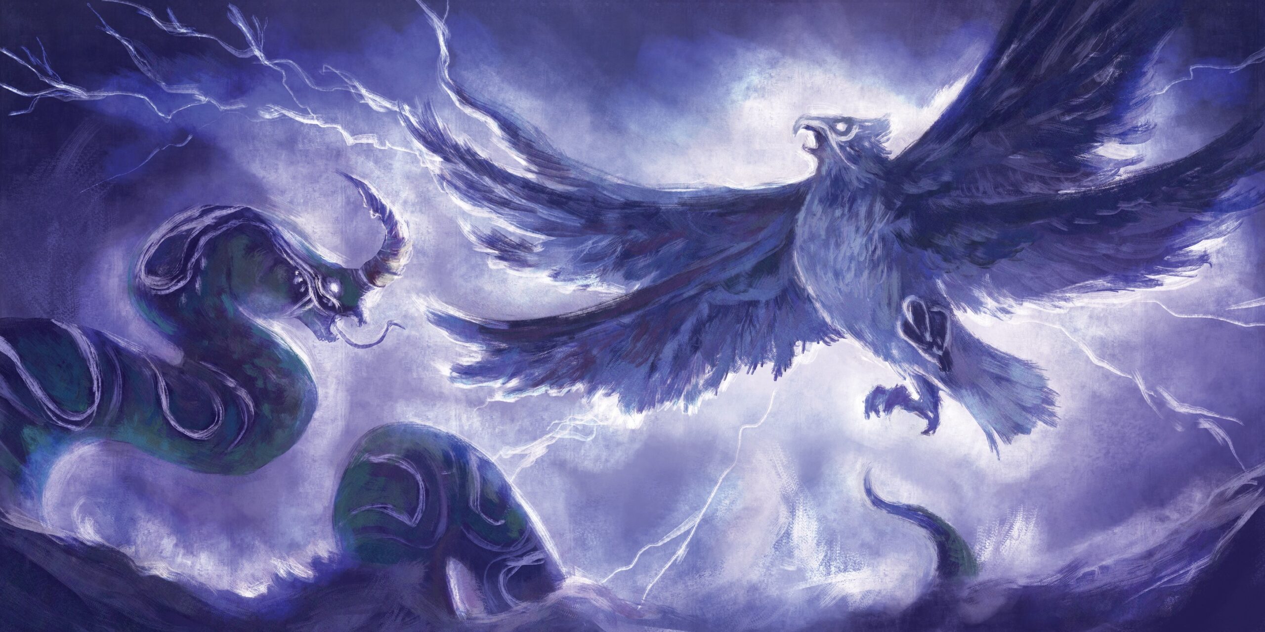 Entre os Ojibwe, o Thunderbird é um protetor da humanidade. Ele combate os Mishipeshu, os “espíritos serpentes” das águas profundas — entidades associadas à escuridão e à destruição.
