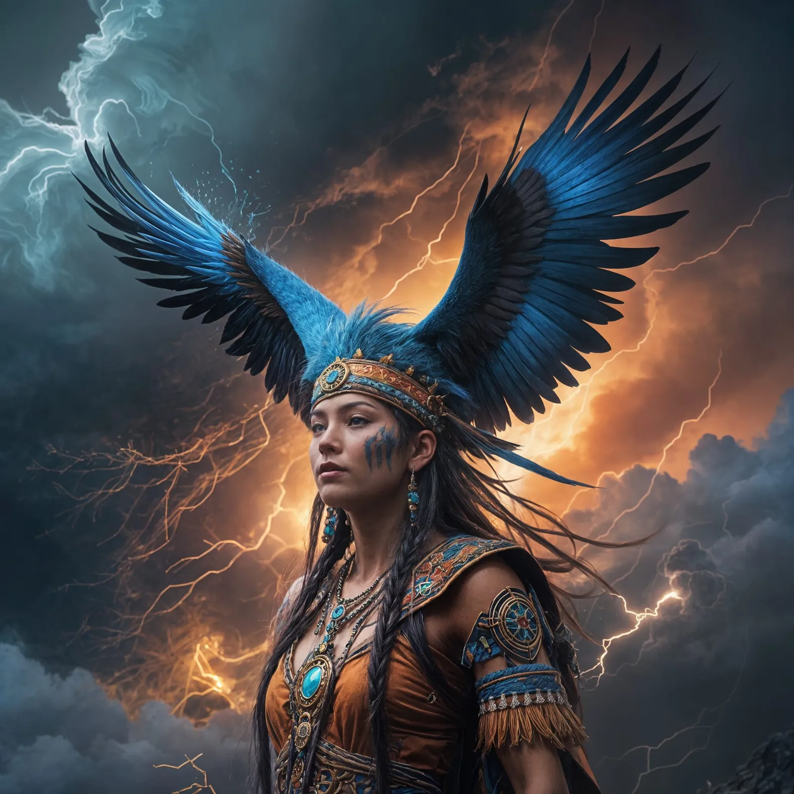 Entre as histórias mais antigas, ecoadas em cantos cerimoniais e pinturas sagradas, encontramos relatos de seres luminosos que desciam das nuvens em meio a trovões e ventos fortes. As tribos Lakota, por exemplo, falam dos Wakinyan, os Homens do Trovão — poderosas entidades aladas que controlam as tempestades e trazem o fogo do céu. Dizem que quando um raio cai, é o bater das asas desses seres atravessando o firmamento.