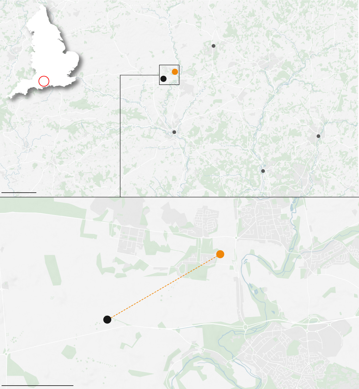 No mapa as posições de Stonehenge (ponto preto) e das Muralhas de Durrington (ponto laranja).