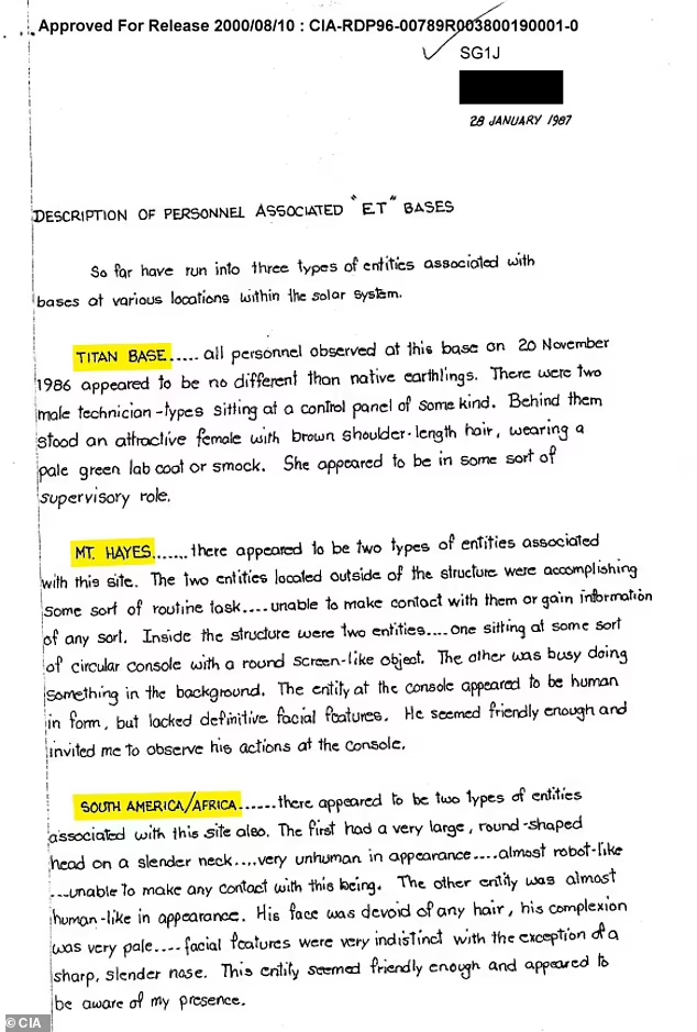 Um desses relatórios, intitulado “Descrição do pessoal associado às bases ‘ET'”, detalhou uma sessão na qual um observador remoto recebeu alvos desconhecidos e foi solicitado a descrever o que havia percebido.