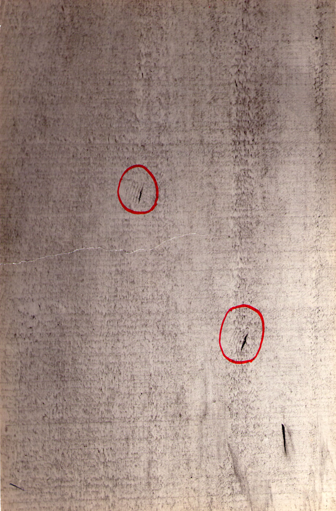 Agachou-se para poder observar melhor, pensando na maneira mais fácil de interceptar aquel homem, dentro do terreno da companhia. Escutou entretanto um ruído que vinha de uma direção próxima ao escritório, onde pode notar um outro homem, em uma das janelas, ao lado da porta, vestido de calça e camisa de mangas compridas, ambas escuras. Uma vez que agora teria de enfrentar duas pessoas e não possuindo arma de fogo, entrou na oficina (cuja porta permanecia aberta) e muniu-se de um conduite (tubo flexível para instalação elétrica)com uns 50 cms de comprimento. Evitando fazer qualquer barulho (graças aos sapatos de sola de borracha), acercou-se do estranho do escritório, que lhe parecia olhar para dentro, pela vidraça. Para pô-lo fora de combate, vibrou com o conduite dois violentos golpes, os quais, apesar de serem endereçados com destreza e força, foram aparados com movimentos rápidos pelo estranho, indo atingir a madeira do lado. Quando lá estivemos, 5 meses após, fotografamos a mossa deixada na madeira pelo golpe do conduite (veja foto nº 29). O intruso vinha escondendo o rosto munido de máscara, observando toda aproximação e pôde assim logo entrar em um corpo-a-corpo, puxando as mãos da testemunha na sua própria queda, rolando ambos pelo chão. Enquanto lutavam, Daildo notou que seu adversário possuía uma força regular, não podendo entretanto observar os olhos, completamente escondidos pela máscara (da mesma cor da camisa) que cobria a cabeça. Escutava entretanto, de vez em quanto, uns “grunhidos”, do seu adversário, que nada tinham em comum com as nossas línguas. Por uma das janelas do escritório saiu então outro homem, igualmente vestido, e os dois, após 10 ou 12 minutos de luta, quase o dominaram, apesar de que o Sr. Daildo, com seus 22 anos, e compleição compacta (1,60m) e robusta, se deve constituir num bom lutador. Estavam já pisando na sua mão, segurando e imobilizando o seu braço, quando chegou uma terceira personagem, possivelmente aquela do barranco, apresentando-se sem máscara, com um rosto de pele clara. Seu cabelo era arruivado, cortado, e de consistência mais dura que a do nosso, ao toque da mão, conforme Daildo pôde verificar durante a luta que continuava e se exacerbava.