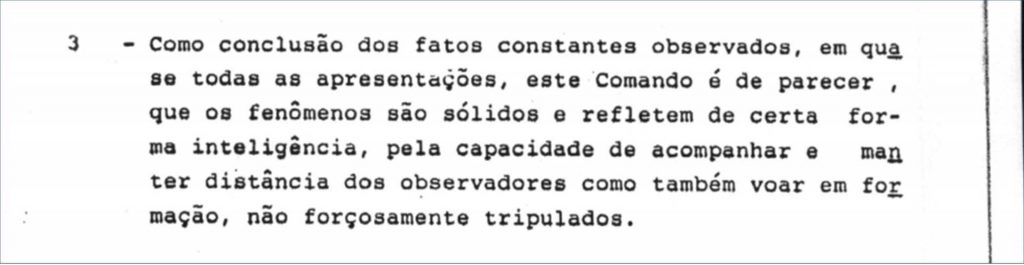 Ao longo de toda a manifestação ficou bem claro que ela ocorreu sob um princípio inteligente, coordenado, com intenção e propósito. Os alvos eram sólidos, pois foram avistados e registrados nos radares e responderam de forma inteligente à sinais luminosos e à manobras das aeronaves em perseguição. O documento, entretanto, faz uma ressalva importante: “não forçosamente tripulados”, ou seja, para os militares talvez eles não fossem de fato tripulados, sendo algo como um drone telecomandado. Essa conclusão soa um pouco estranha, pois um objeto não tripulado possui tamanho menor, se comparado com um tripulado. O que dizer então dos artefatos com 100 metros de diâmetro ou mais, avistados e relatados naquele dia? Apenas se levarmos em conta possíveis tripulações é que podemos explicar o tamanho de veículos com estas dimensões.