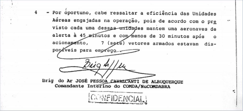 Por fim, outra informação relevante apresentada nessas considerações iniciais refere-se ao monitoramento ocorrido a partir da Base Aérea de Anápolis, melhor preparada para ações militares, que contribuiu de maneira significativa para os procedimentos de interceptação aérea naquela região, com os caças Mirage IIIEBR.