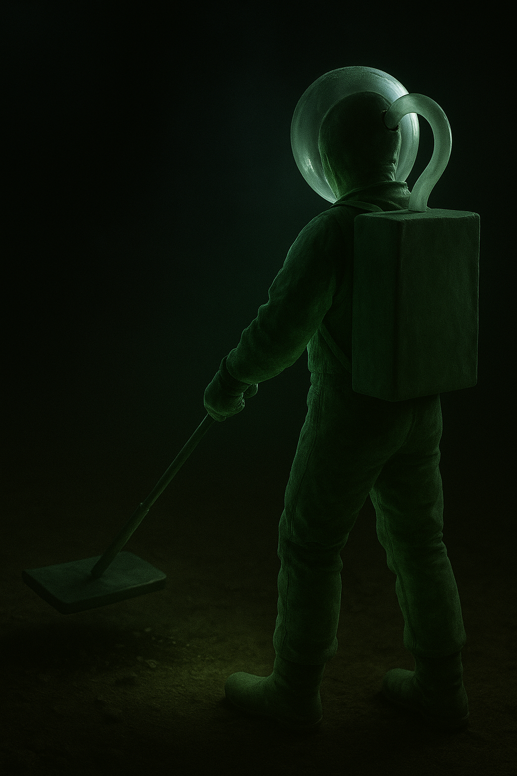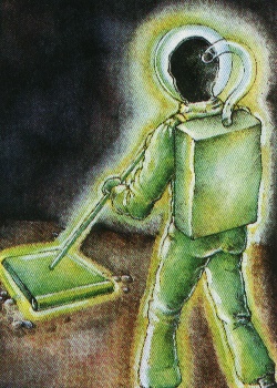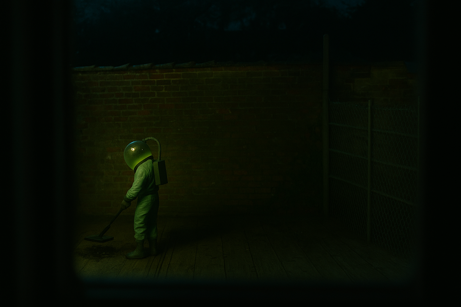 Em uma das mãos portava um instrumento que poderíamos comparar a um aspirador de pó caseiro, ou a um de detector de minas subterrâneas. Movia-se lentamente, da esquerda para a direita, por cima de um montão de lixo que a testemunha havia deixado dias antes.