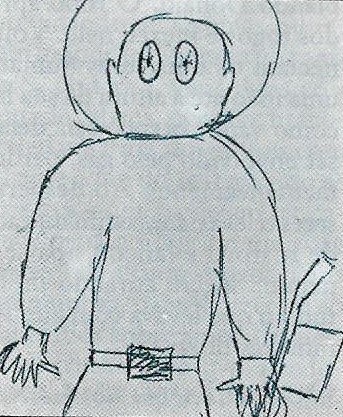 Desenho do humanóide observado pelo Sr. MVM, em Bruxelas, Bélgica, segundo interpretação da Revista Stendek. O extraterrestre parecia “trabalhar” no jardim da testemunha.