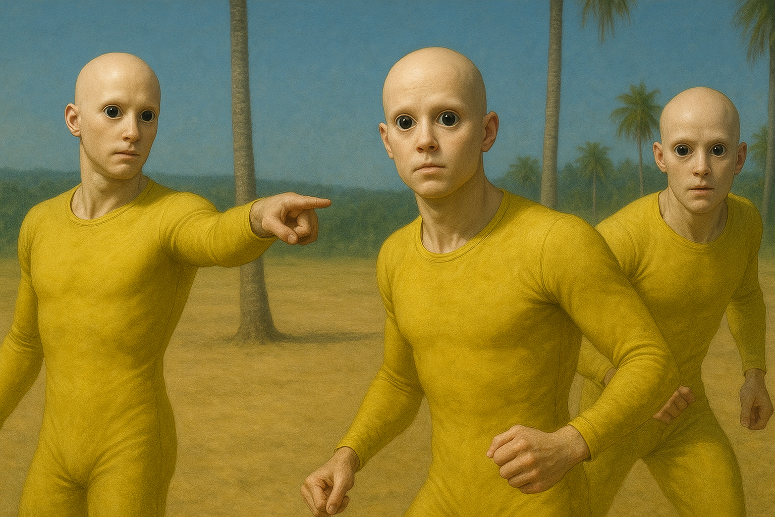 Os três tripulantes tinham um aspecto humano, sendo calvos e vestindo um traje amarelo desbotado.