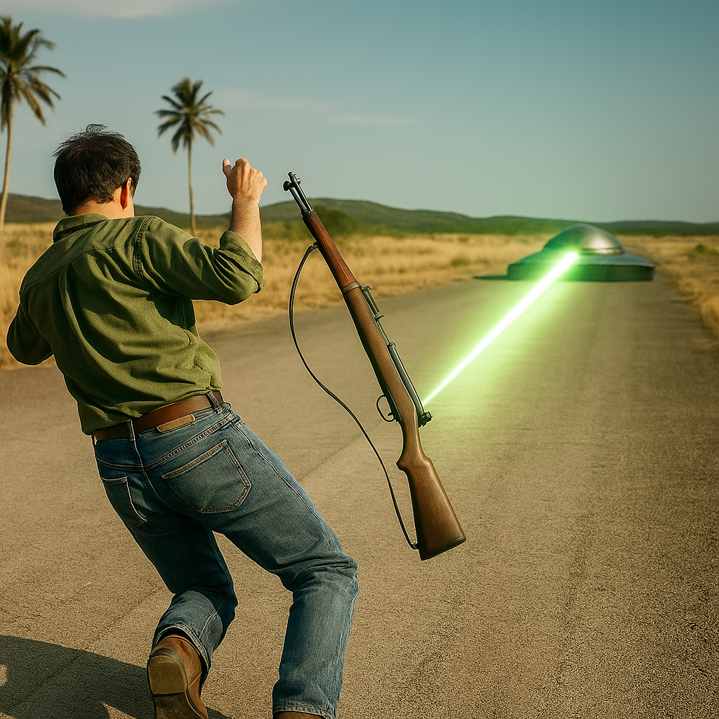 Após Inácio de Sousa disparar contra o UFO, o objeto dispara um feixe de luz esverdeado no capataz.