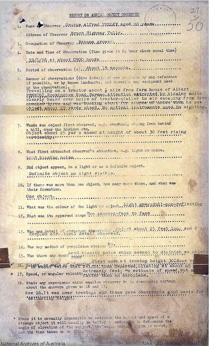 George Pedley relatou sua experiência à Polícia de Tully às 19h30 do dia 19 de janeiro. Por volta das 7h do dia 20 de janeiro, George Pedley e o Sargento AV Moylan foram ao local do incidente. O Sargento Moylan contatou a Base da RAAF de Townsville por telefone na manhã de 20 de janeiro. O Tenente de Voo Wallace informou ao Sargento Moylan que encaminharia um questionário proforma para George Pedley preencher. Na sexta-feira, 21 de janeiro, o Tenente de Voo Wallace confirmou o envio de duas cópias do formulário proforma pelo correio no mesmo dia e também solicitou ao Sargento Moylan que obtivesse “uma amostra da grama da área queimada”. Às 15h30 do mesmo dia, Moylan retornou ao local e coletou uma amostra “da grama da depressão no pântano”. O formulário foi preenchido por Moylan com base em suas entrevistas com George Pedley e datado de 26 de janeiro de 1966.