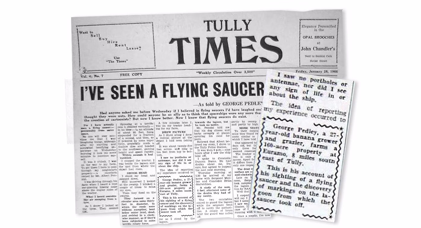 Na manhã do dia 19 de janeiro de 1966, por volta das 9:00, um fazendeiro de 28 anos de idade, chamado George Pedley, estava dirigindo seu trator próximo à Horseshoe Lagoon, na propriedade de Albert Pennisi, near Tully, ao norte de Queensland, na Australia. Quando ele estava a 25 metros da lagoa ele ouviu um ruído mais alto que o barulho do trator.