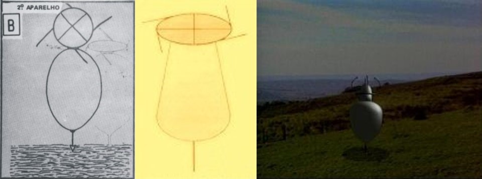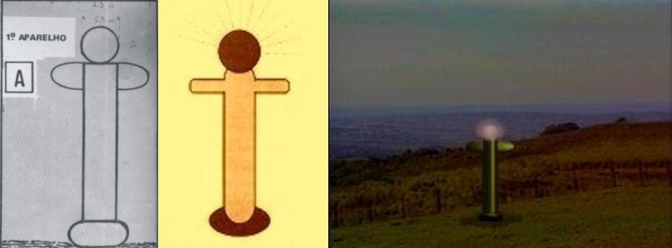 O primeiro aparelho observado segundo diferentes autores. A primeira, em desenho da SBEDV, a segunda de pesquisadores do CEVAPPA e a terceira elaborado pela Rede Globo, especial para o Globo Repórter de 1993.