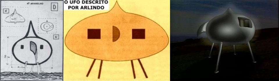 Vejamos o CE III, com a prévia descida de um grande UFO ovalado. Apoiou-se em 4 pés, era branco e caracterizado por uma “ponta” em sua parte superior. A descrição coincide com objeto mostrado na OVNI Documento n° 4, pág. 18, o ultimo objeto de cima para baixo. (1ª fila vertical). Na revista o objeto possui três pés e o de Arlindo quatro. Achamos que seria o mesmo tipo de aparelho e a diferença de 1 pé comentaremos ao falar das Pistas.