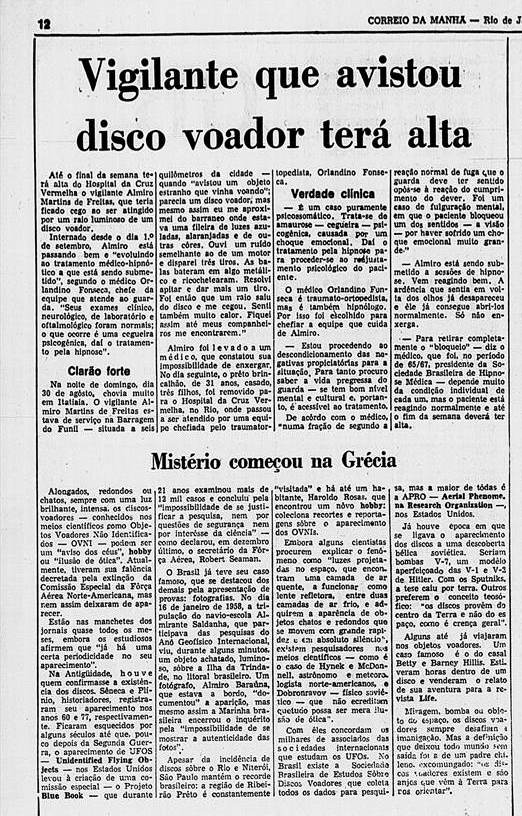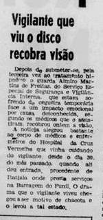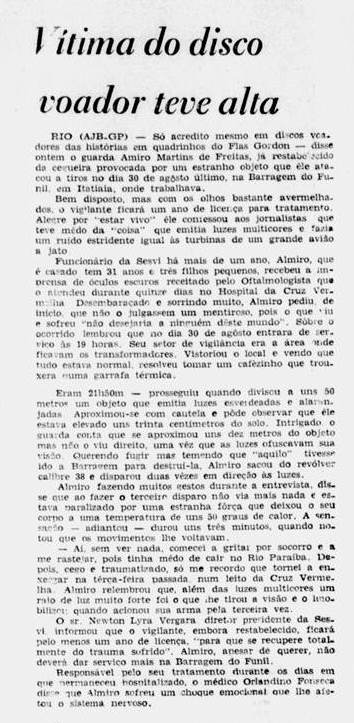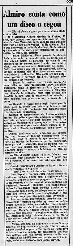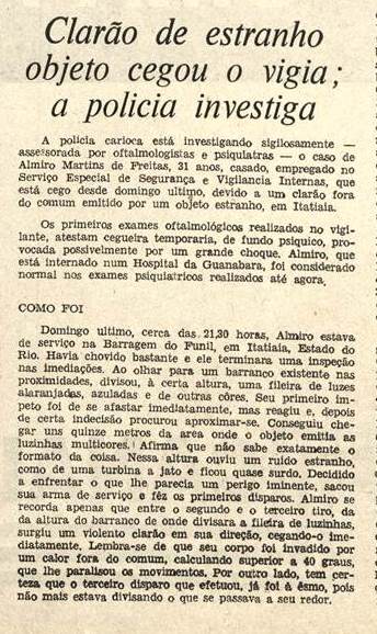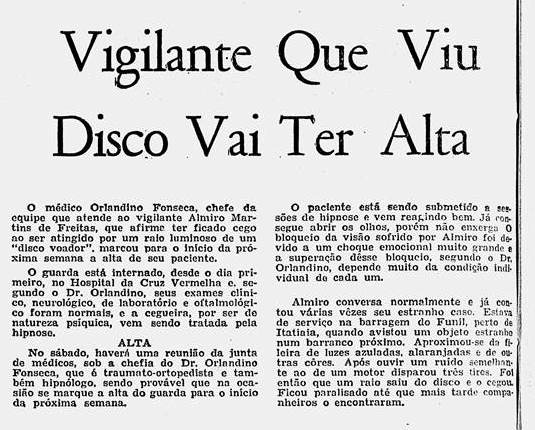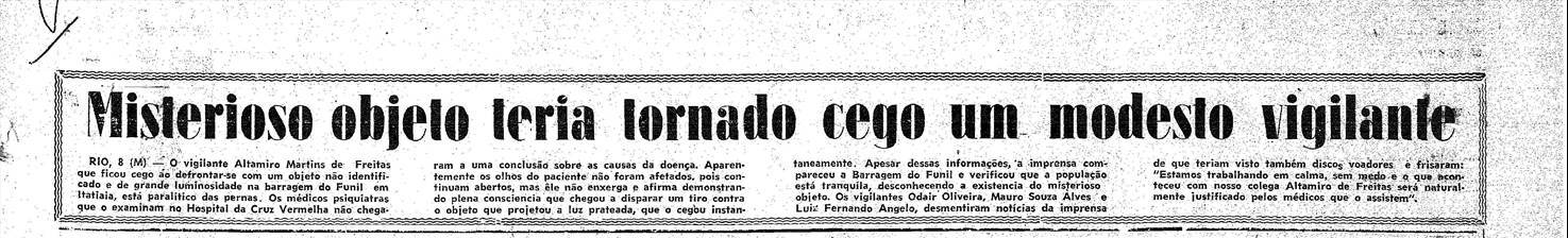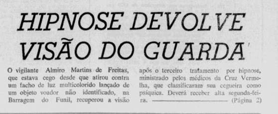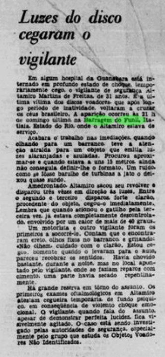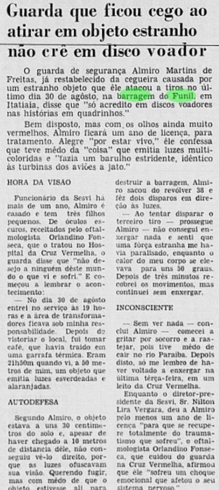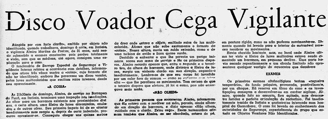 Em 1970 ocorreu um impressionante caso ufológico com efeitos fisiológicos verificados na testemunha. No começo da noite de 30 de agosto, o guarda Almiro Martins de Freitas foi surpreendido por um objeto em forma de charuto, com aproximadamente 20 metros de comprimento que o cegou, após a testemunha ter disparado duas vezes contra o objeto.
