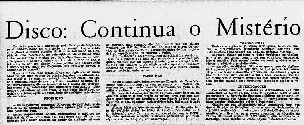 As semanas seguintes, os jornais deram grande destaque ao fato. As reportagens sugeriam que Almiro havia entrado em pânico ao ver faíscas emitidas pelos postes de energia Cinco dias após o fato, o Ministério da Aeronáutica informou que o caso estava sob investigação e que os resultados seriam anunciados em breve, porém nada mais foi publicado pelo militares. O Estado Maior da Aeronáutica impôs silêncio sobre o caso e a imprensa foi impedida de entrevistar o vigia.