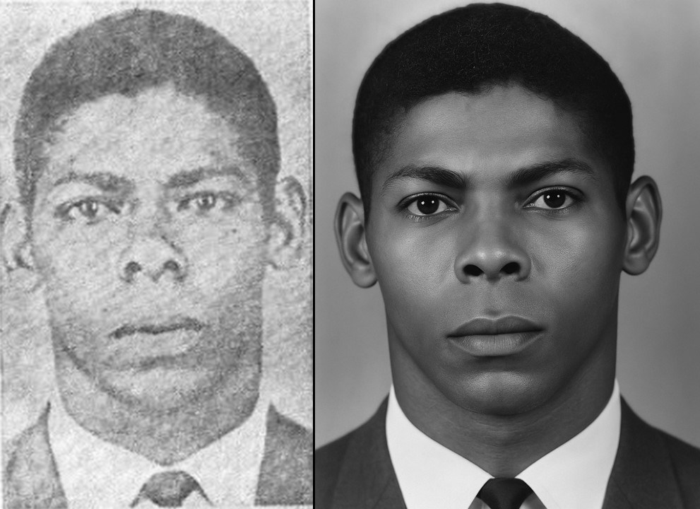 À esquera, o vigia Almiro Martins de Freitas, em fotografia reproduzida em boletins ufológicos. À direita, a imagem melhorara com Inteligência Artificial.